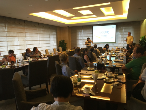 會上,董事長黃永博士詳細講解了太抗系列產(chǎn)品的作用機理及各地應(yīng)用案列,得到了所有與會人員的高度關(guān)注。當講到太抗產(chǎn)品的安全性時,外賓們紛紛將在燒杯中的樣品看了又看,聞了又聞,可能實在覺得看似酸奶的生物農(nóng)藥著實稀奇。PPT放映結(jié)束后,外賓們接連提問,關(guān)于產(chǎn)品的保質(zhì)期、使用技術(shù)、投入產(chǎn)出比等等,董事長一一解答,連喝水的空都沒有。其中,來自來自維多利亞州的Gary Jeans講到其種植有4000公頃有機李用于出口中國,非常希望能用上太抗系列產(chǎn)品!此外,有外賓提出想帶些樣品回澳洲,也有外賓提出想和我公司澳洲研發(fā)人員深入交流,更有外賓要了黃董厚厚一疊名片說是要去澳洲幫我們做宣傳!