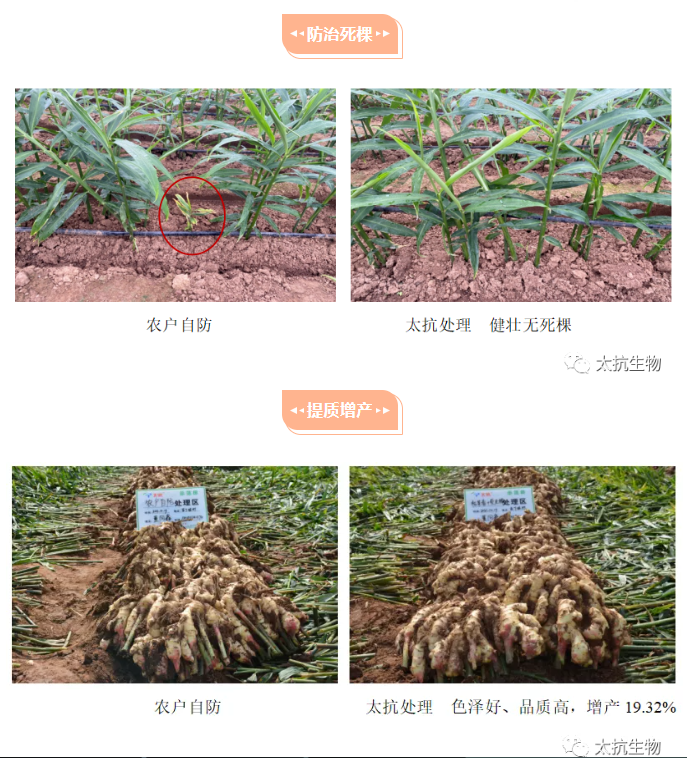 自2016年至今,太抗?產(chǎn)品一直深耕于大姜的各主產(chǎn)區(qū),并且在防病增產(chǎn)、解決大姜的土傳病害上屢立戰(zhàn)功。今年“姜”山如故,太抗?產(chǎn)品依舊光彩熠熠,我們來看一下示范效果吧: