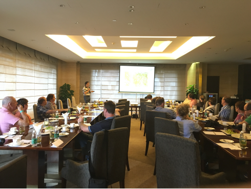 會上,董事長黃永博士詳細講解了太抗系列產(chǎn)品的作用機理及各地應(yīng)用案列,得到了所有與會人員的高度關(guān)注。當講到太抗產(chǎn)品的安全性時,外賓們紛紛將在燒杯中的樣品看了又看,聞了又聞,可能實在覺得看似酸奶的生物農(nóng)藥著實稀奇。PPT放映結(jié)束后,外賓們接連提問,關(guān)于產(chǎn)品的保質(zhì)期、使用技術(shù)、投入產(chǎn)出比等等,董事長一一解答,連喝水的空都沒有。其中,來自來自維多利亞州的Gary Jeans講到其種植有4000公頃有機李用于出口中國,非常希望能用上太抗系列產(chǎn)品!此外,有外賓提出想帶些樣品回澳洲,也有外賓提出想和我公司澳洲研發(fā)人員深入交流,更有外賓要了黃董厚厚一疊名片說是要去澳洲幫我們做宣傳!